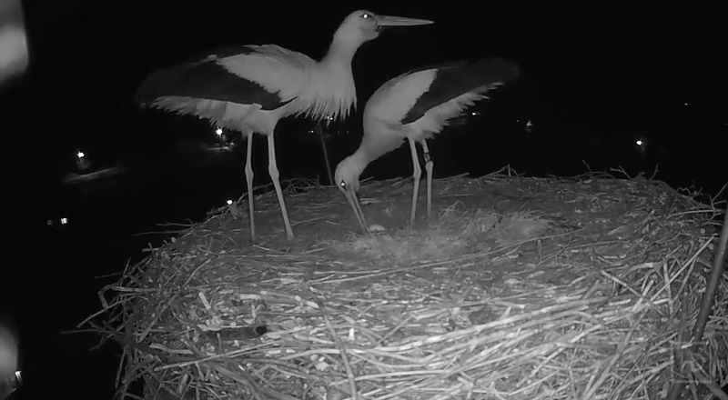 Ve čtvrtek v noci 04.04.2019, pár čápů oslavil svůj první vejce v hnízdě v Bohuslavicích češtině. Vidět vejce, dvě mouchy napřímil a začal rychle zasáhnout zobáky.