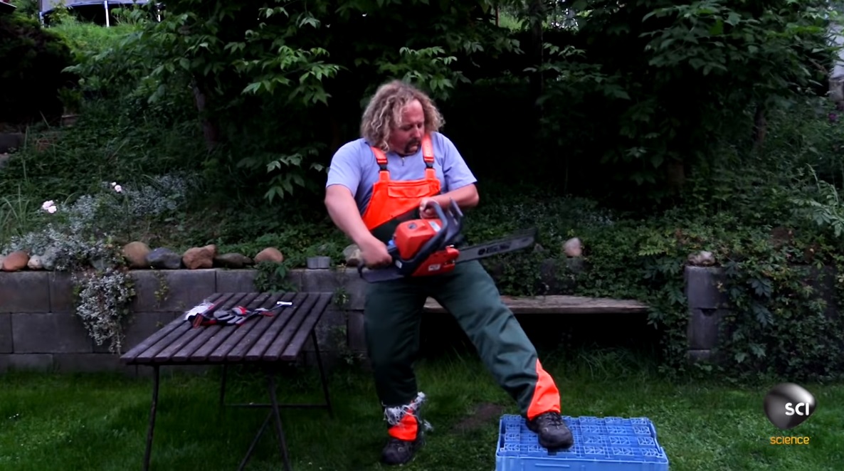 Člověk se snaží kalhoty vyrobené speciálně k ochraně nohou od řetězových nehod. Vlákna z aramid chránit nohy ostří rychle a zablokovat řetěz.