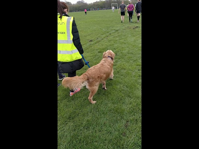 Zlatý retriever vyjadřuje svou radost skokem.