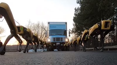 Jako psi tahání saní, Deset roboti SpotMini americké firmy Boston Dynamics vytáhnout kamion na parkování. Sklon je asi 1% a vozidlo je v neutrální převodový stupeň.