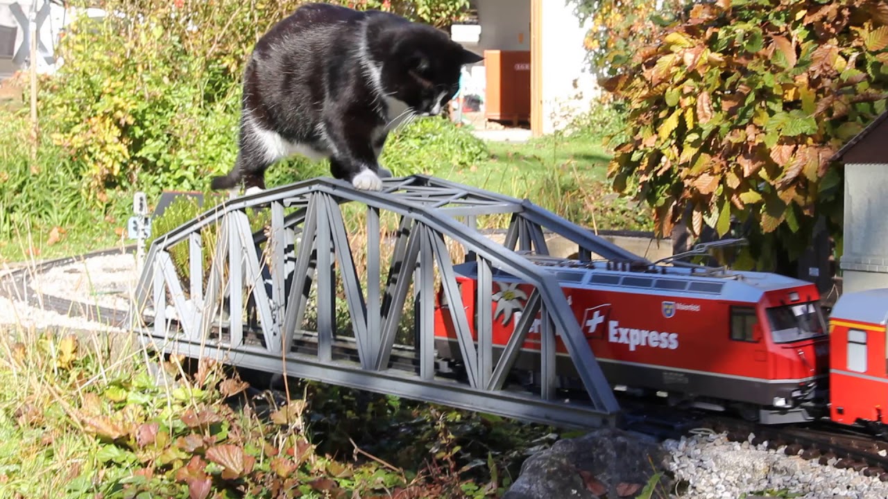 Obrovská kočka léčí vlak na mostě. Naštěstí kočičí monstrum klesne bez vykolejit vlak.