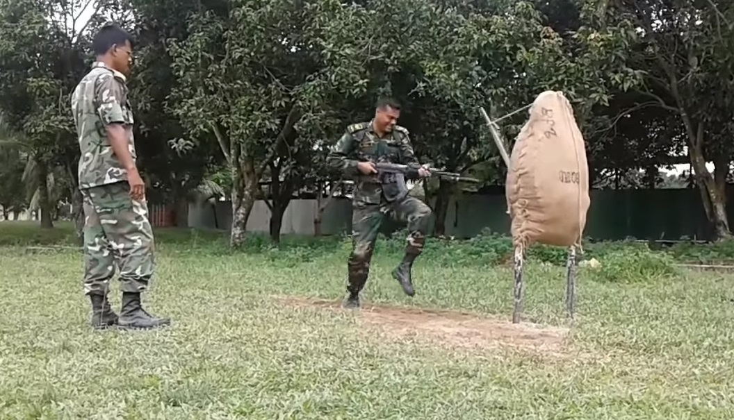 Bangladéšské vojáci vycvičení s bajonetem. Útok jeden po druhém s bodáky do panenku křičí.