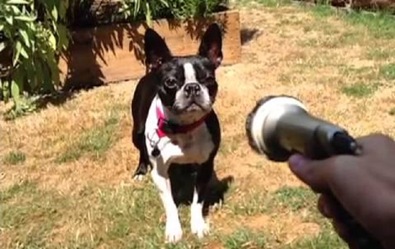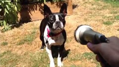 Pes čeká netrpělivě se dostat vodu z hadice.