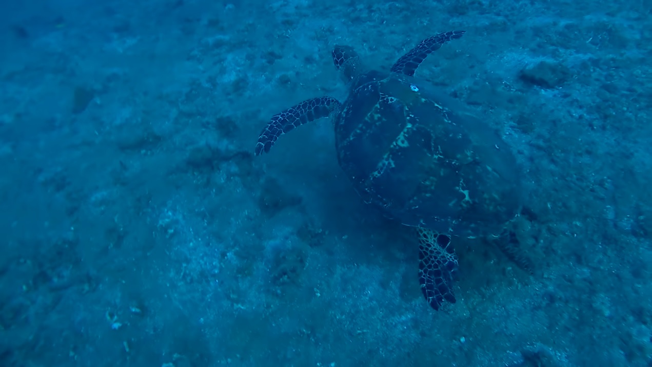 Sea Indonesia, želva s ústřice přilepený ke stěně blíží potápěče bych se zeptat pomoc. Potápěč odstraní ústřice a želva opustí ulevilo.
