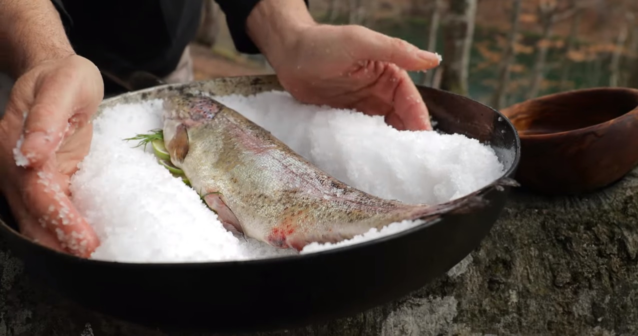 Almazan Kitchen kanál ze Srbska ukazuje naše vaření pstruha vypalováním do solné krustě, spolu s zeleninový salát.