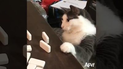 Kočka špatně reagují, když vidí, že ztratil hra domino.