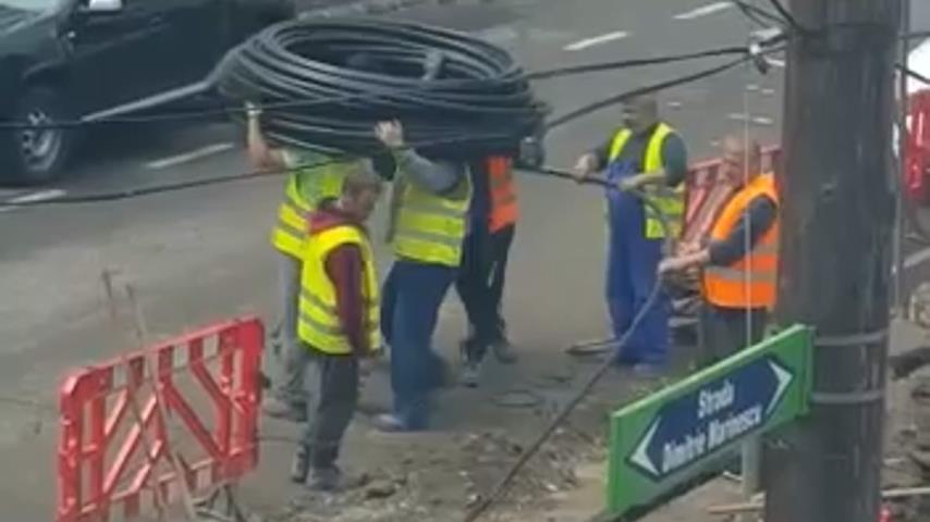 bez cívky, Pracovníci tým pracují společně, aby odhalili kabelu a umístěte do příkopu kopal v cestě. Čtyři dělníci zvednout cívku a otočit tak kabelových odvíjí.