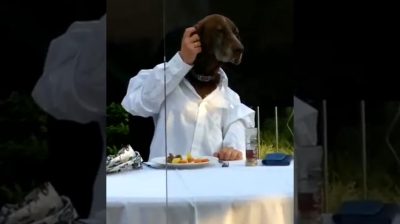 V restauraci v Belgii, dobře oblečený pes snaží povečeřet s lidskou rukou.