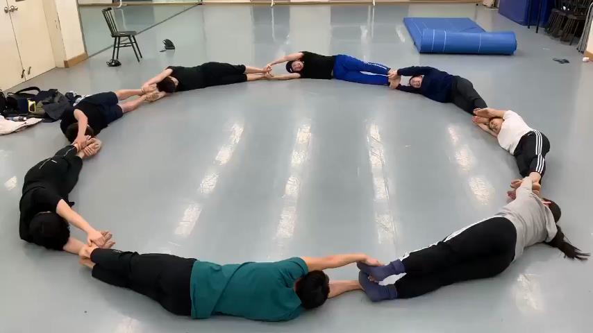 V tělocvičně, 8 přátelé hrát zábavné hry v kruhu. Ležící na podlaze, všichni drží nohama souseda tvoří kruh. Pak se všichni shromažďují jejich těla a současně snížit poloměr kruhu. Pak se vrátit ven a celý cyklus znovu otevře.