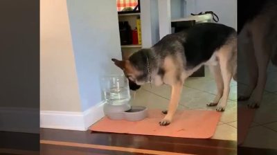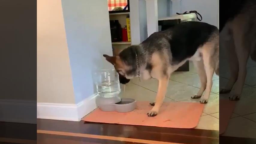 Německý ovčák pitné vody v automatické dávkovače vody pro domácí mazlíčky. kdykoliv pití, braní nádrž vodní bubliny. Pokaždé, když se pes přestal pít pozorovat tento podivný jev, do velké bubliny ho bude strašit.