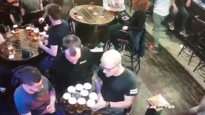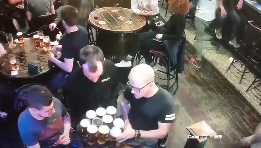 Číšník v baru obtížnosti porce sklenice s pivem, který bude spadat dvakrát z disku během několika minut.