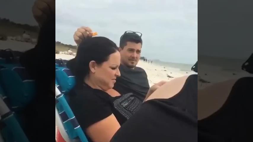Na pláži, člověk dělá plaketu ke své ženě diskrétně umístit potravu pro racků na hlavě.