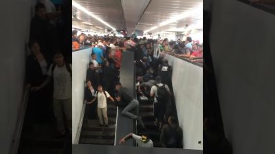 Stovky lidí jsou na výstupu z eskalátoru, způsobující nebezpečnou zahlcení.
