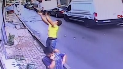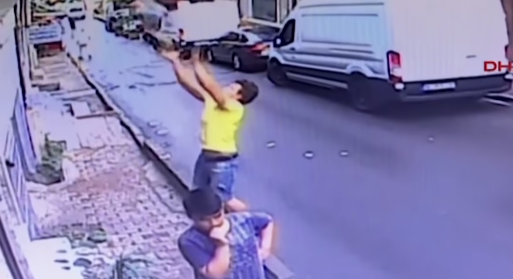 Feuzi Zabaat, 17-letý mladík v Istanbulu Turecko, chytí ve vzduchu holčičku dvěma lety spadl z druhého okna podlaží v budově.