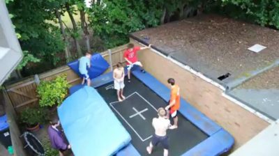 V Anglii, mladý člověk dělá obrovský skok na trampolíně s pomocí pěti přáteli. Čtyři z nich synchronizovat oscilaci trampolíny, aby odrazit výš, a pátý je zodpovědný za umístění vrstvy zastavit odrážení.