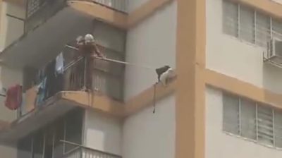 V Kuala Lumpur, Malajsie, skupina hasičů podaří zachránit kočku chodit na římse 10. patře budovy.