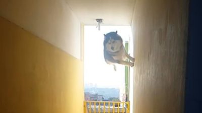 V Sao Paulo, Brazílie, pes je impozantní skok parkour styl projít bariéru a dostat se na šéfa.