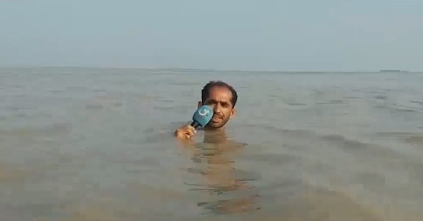Ο Azadan Hussain, reportér z Pákistánu, který pracuje v místním kanálu GTV News, Zdá se, že se ponoří do vody, s cílem, aby se více dramatické reportáž o záplavách v oblasti Paňdžábu.