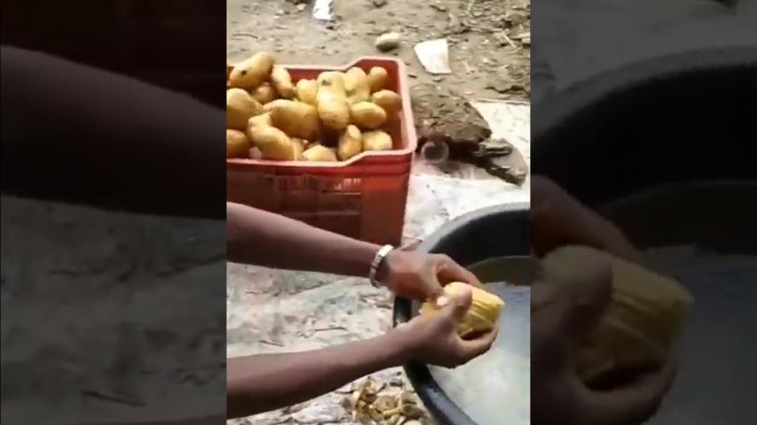 Muž řezání brambory velmi rychle, aniž by viděl.