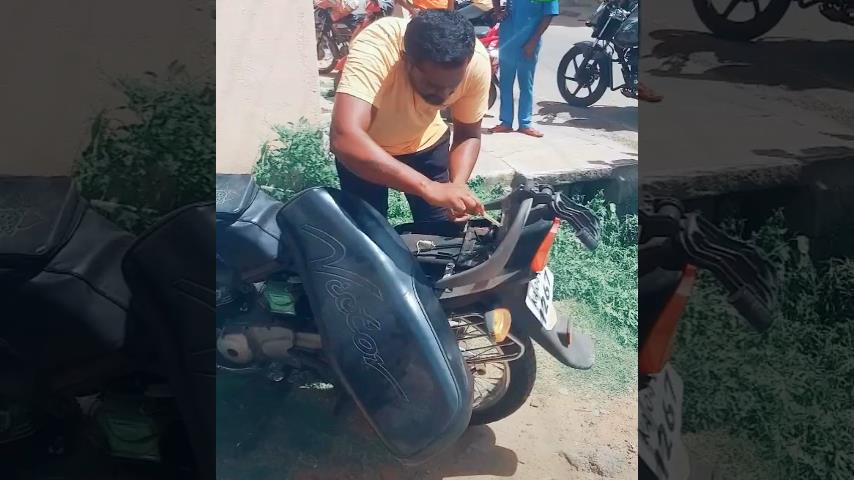 Město Doddaballapura India, člověk se snaží najít kobru, která se proplížit pod sedlem motocyklu.