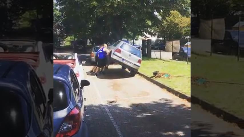 Tři muži otočit dva vozy, které byly zaparkované uprostřed silnice.