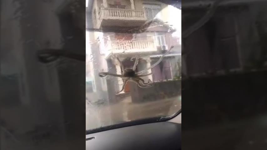 Ve čtvrtek 8. srpna 2019, silné větry hurikánu Lekima hodil dvě malé chobotnice žije na předním skle automobilu cestování ve Wenling, pobřežní město v provincii Zhejiang v Číně.