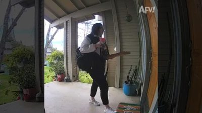 Žena si koupil pizzu a jde domů s plné ruce. Pokusu o otevření dveří stlačením krabici pizzy, ale všechno pokazí a pizza skončí na podlaze.