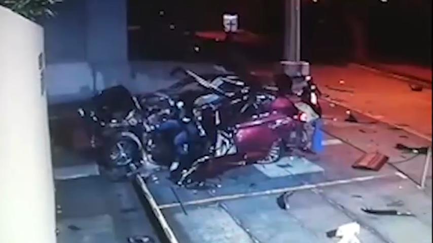 Vůz zcela zničen po převrácený několikrát po násilném nehodě. Řidič se zdá, že přichází ven bez úhony z rozpuštěného vozidla, že právě ztratil botu.