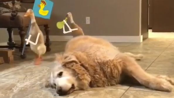 Dvě kachny průvod na zvuk polnice a panuj psa sedící, ležící na zemi. Legrační doodle režíroval Jimmy Něco. Zdrojem videa: https://www.instagram.com/p/Bx5Lh0Lg2_V