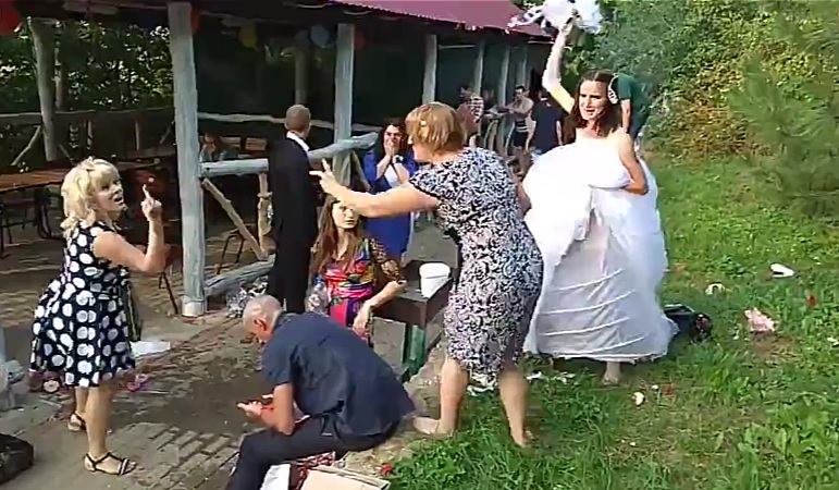 Intoxikovaných hosté a příbuzní přijdou do rukou konci svatebního obřadu někde v Rusku.
