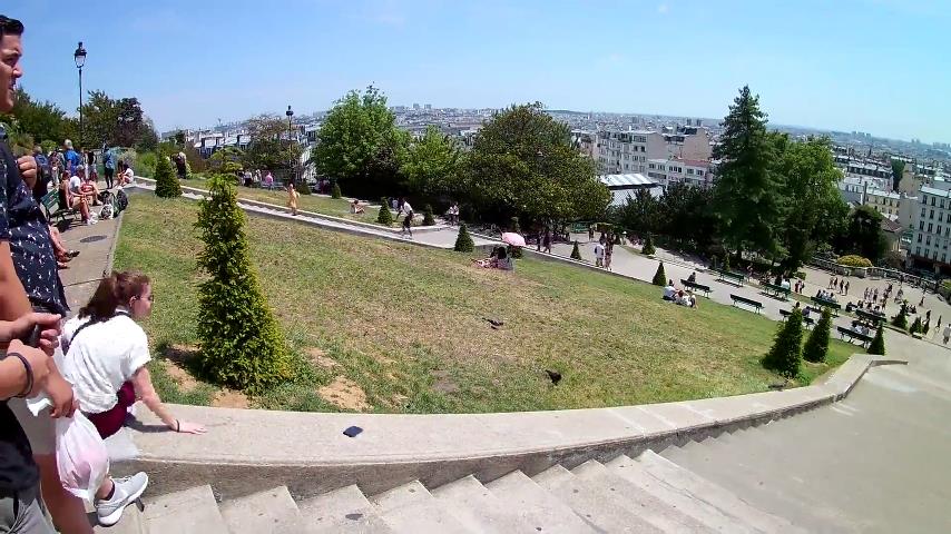 Hledám nějakou zábavu, smartphone uniká z jejího majitele pro výrobu skluzavka podél schodech Louise-Michel náměstí v Paříži.