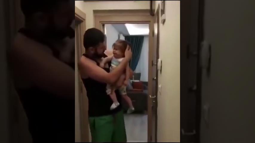 Táta bije ruku na dveřích domu předstírat, že jeho malá dcerka držení zbraní, udeřil do hlavy. Dívka se okamžitě začne pláč ptát utěšuje její otec.