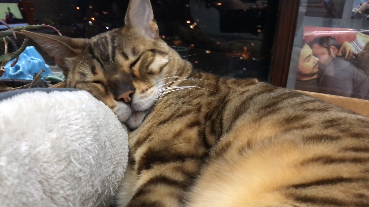 Joaquin Baldwin z Paraguaye nahrávat video chrápání kočku od Elton, spí těžce do boxu.