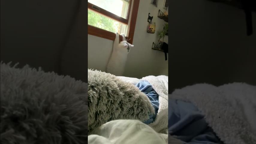 Kočka se snaží uniknout z okna domu, bez velkého úspěchu.