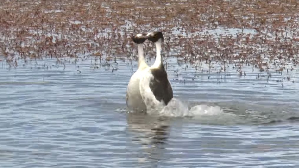 Fun párování Potápka roháč, druh ptactva patří do rodiny Podicipedidae, jezero v provincii Santa Cruz Argentina. Dvojice se zdá být něco jako tančit tango na vodní hladině.