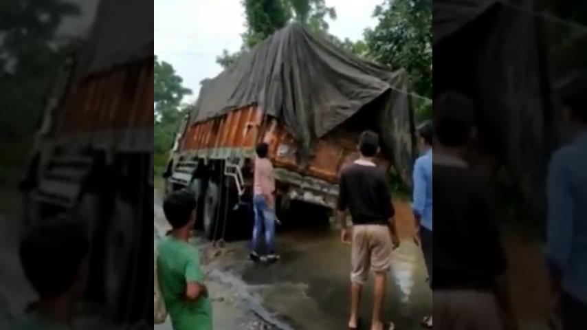 V zatopené ulici v Indii, nákladní automobil zastavil, co se dostal z jedné strany ve velké kaluži. Se snaží obnovit, člověk se bude snažit vyprázdnit svůj náklad.