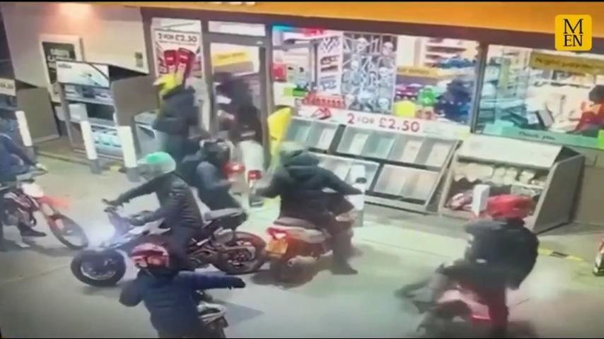 Asi 60 maskovány lupiči na motocyklech, zaznamenaný bezpečnostními kamerami vyloupení mini market na čerpací stanici v Baguley Manchesteru.