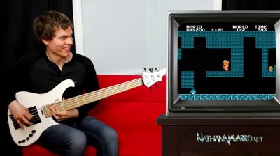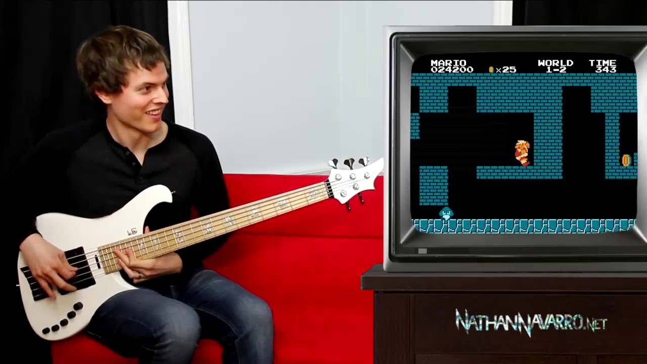 Basista Nathan Navarro napodobuje zvuky a hudbu ze hry Super Mario Bros na basu.