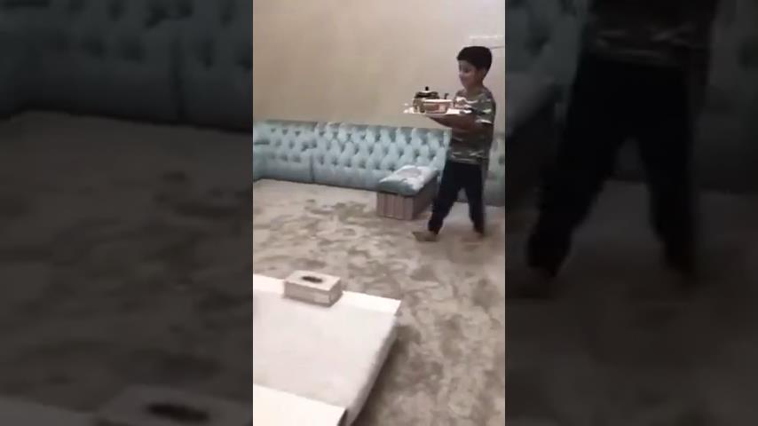 Malý chlapec předstírá přinést konvici s horkou vodou, a aby se žert pro tátu.
