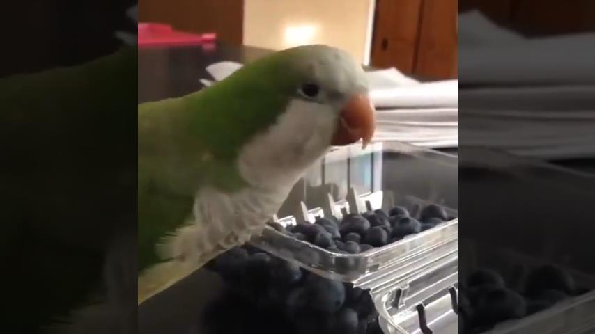 Papoušek se snaží jíst hrozny z plastového obalu, a podrážděné s víkem.