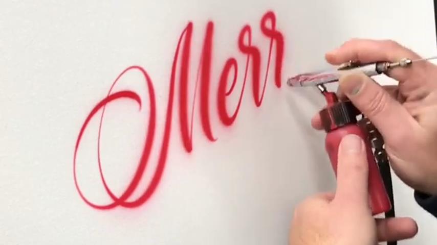 Kaligrafa Ken Johnson přál Merry Christmas jeho Instagram, psaní „Veselé Vánoce“ airbrushem.