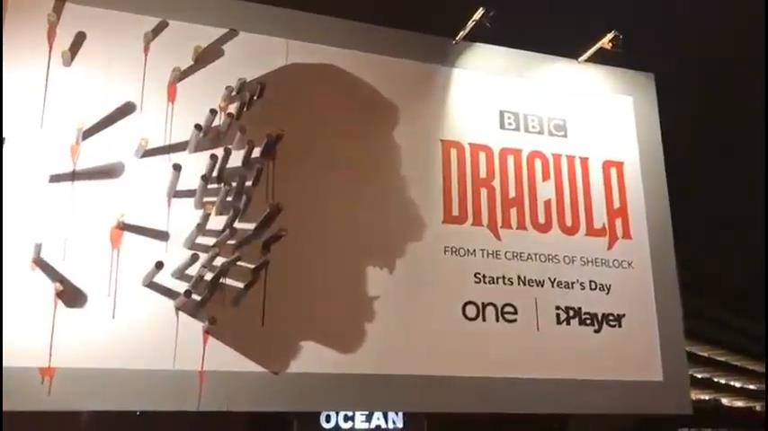 Marketingové oddělení BBC měl velmi dobrou představu o zřízení plakát, která by propagovala novou minisérii „Dracula“.. Tvář upíra tvořeného stíny některých hromad, které jsou strategicky umístěny na desce.