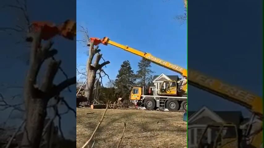 Reverzní přehrávání videa, kde řezací stroj řeže větve stromu s pilou na paži.