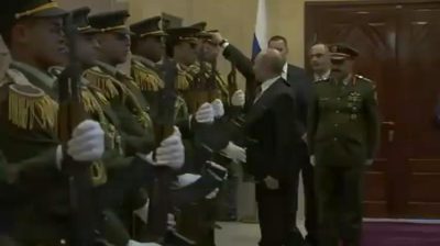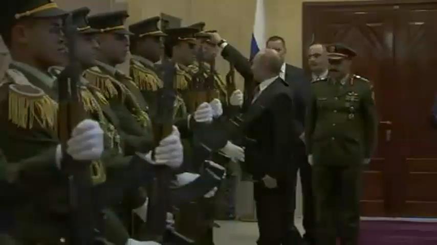 Ruský prezident Vladimir Putin se vrací čepičku na člena palestinského čestná stráž, která se snížila. Incident se stal v pátek 24. ledna, kdy Vladimir Putin navštívil palestinské město Betlém, aby se setkal s Mahmúdem Abbásem..