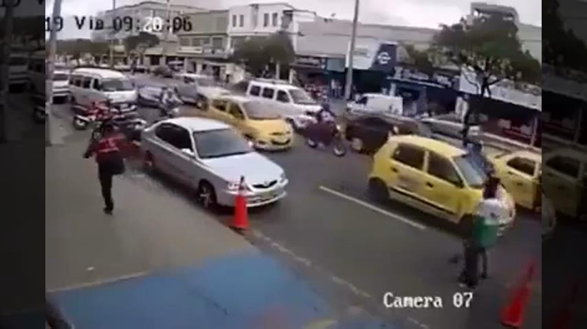 Dva lidé na motocyklu padat na silnici, poté, co se srazil s dveřmi vůz náhle otevřely. Řidič motocyklu bude startovat helmu a hodil na náhodné chodce, se snaží pomoci.