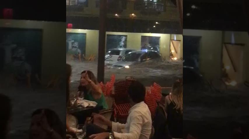Silné deště, které začaly úterý 28/1 a pokračovaly až do středy způsobily mnohé záplavy a sesuvy půdy konstatovat, Minas Gerais, Brazílie. Jeden zachycuje surrealistická scéna, kde peřeje drift auta přímo před skleněnou před restaurací.