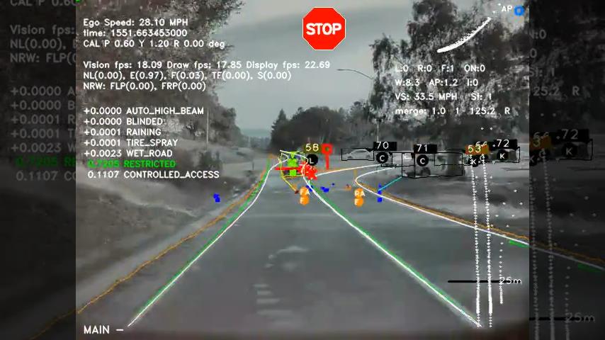 Teslův nám ukazuje, co je počítač vidí vůz při jízdě na autopilota.