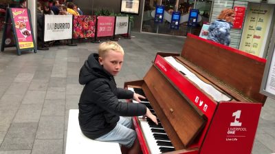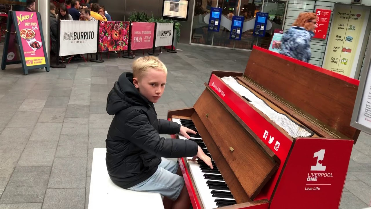 12 let staré Harrison půvab dav u nákupního centra Liverpool One v Liverpoolu, hrát nějaké oblíbené písně na klavír, který existuje v instalačním slotu.