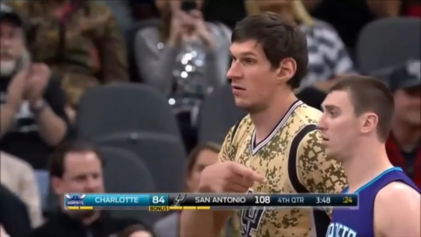 Poněkud překvapený výraz Tyler Hansbrough, když vidí výšky 2,24 m Boban Marjanovic as blížící se u příležitosti.