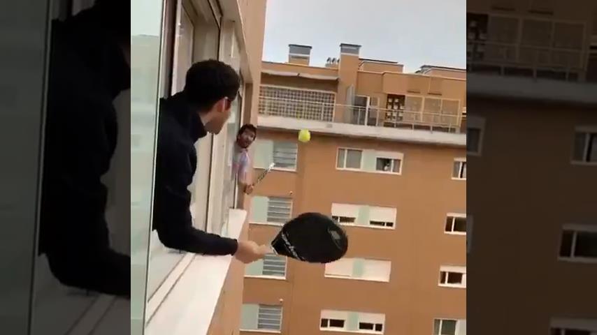 Během období karantény kvůli vypuknutí koronaviru ve Španělsku, Dva sousedé hrají ping z oken svých bytů. Samozřejmě byste měli dbát na to mají velkou zásobu kuliček.